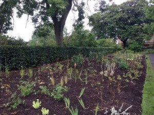It took us three days to plant out the area, we placed out the plants in groups of fives so as to repeat the colour and textures along the breadth of the border. The most challenging thing was making certain the heights descended from the back and the colours and leaf shape did not clash or repeat too often. The plants will take about two years to establish properly; in this time they will be watered and fed in the spring and over the summer months. Next spring the plants will hopefully grow away healthily after their first winter and provide us all with a fantastic display of colour and foliage.