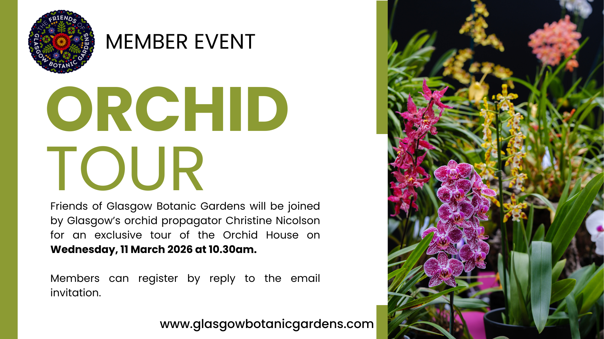 Friends of Glasgow Botanic Gardens will be joined by Glasgow’s orchid propagator Christine Nicolson for an exclusive tour of the Orchid House on Wednesday, 11 March 2026 at 10.30am.