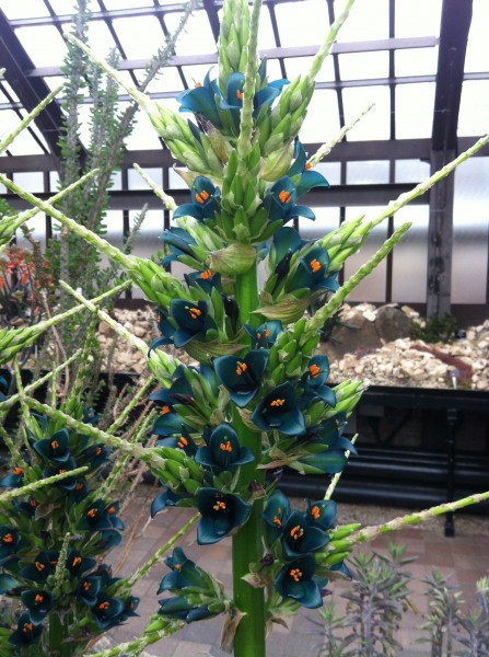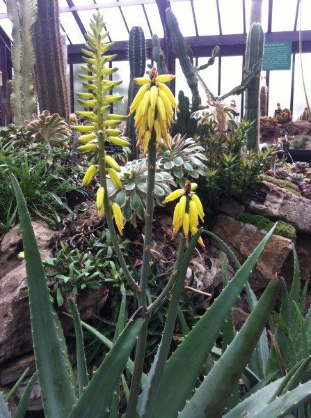 Puya alpestris is a species of bromeliad native to the Chilean Andes. Unfortunately when it has finished flowering the plant will die. This is known as monocarpic, but don’t worry as there are plenty of other offsets to take over. This amazing plant can be seen in the Cacti and Succulent house in the main range of glasshouses at the Botanic Gardens. Another famous plant that can be seen flowering in the Cacti and Succulent house is Aloe vera, I am sure you have all used this plant at some point!